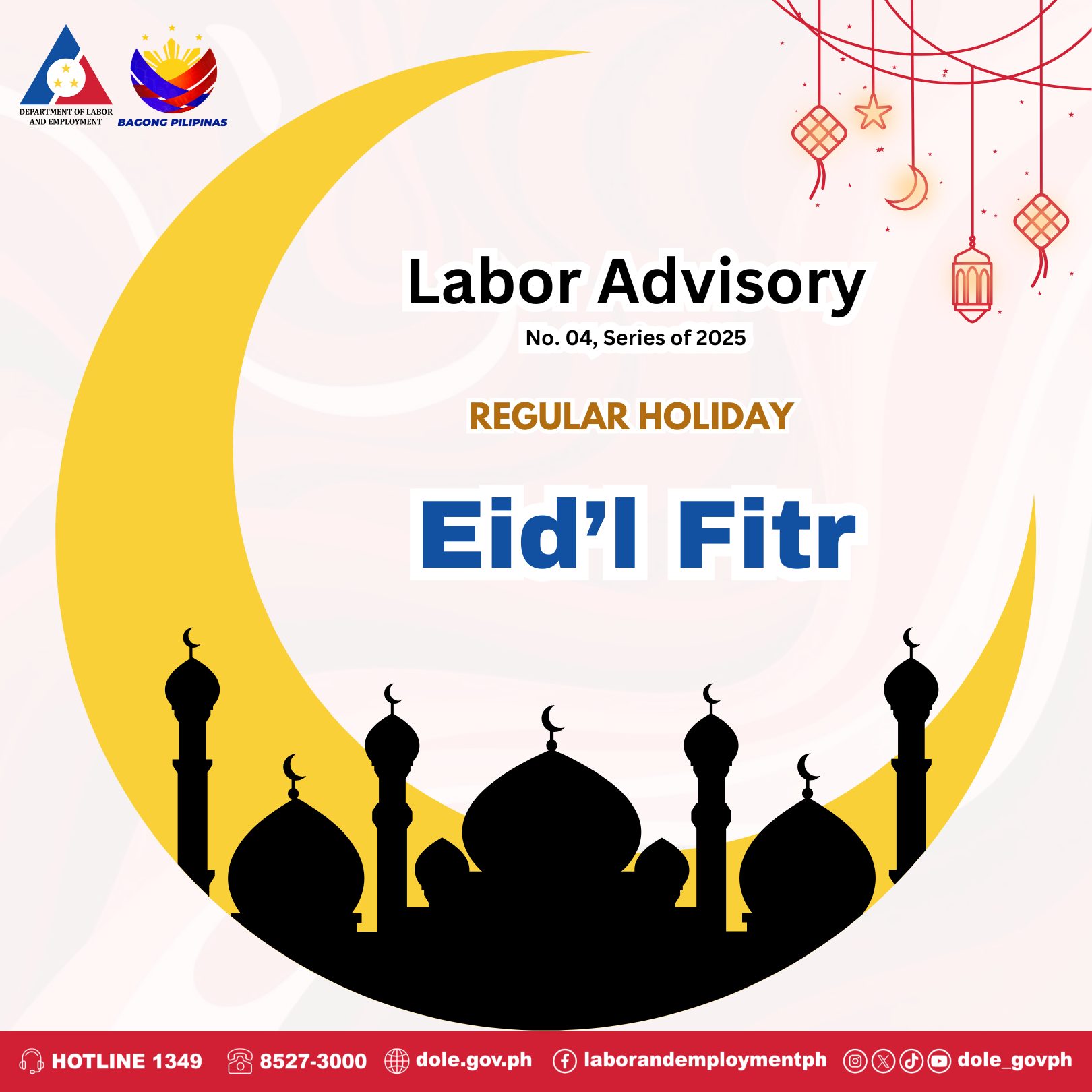 📢 【お知らせ】2025年4月1日(イード・アル=フィトル)給与支払いについて 💰✨ News 2025.03.31 スポンサーリンク 労働雇用省(DOLE)は、民間企業の雇用主および労働者に対し、4月1日の「イード・アル=フィトル(Eid’l Fitr)」が正規の祝日(Regular Holiday)であることを再確認し、適切な給与支払いを行うよう注意喚起 しています。 📌 詳細はコメント欄の公式アドバイザリーをご確認ください。 #BagongPilipinas#SerbisyongDOLE#PhHoliday