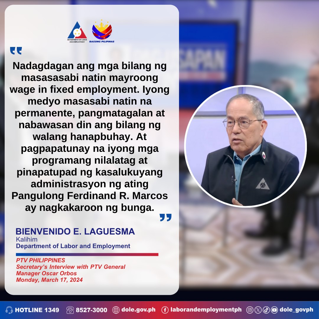【読む】ビエンベニード・E・ラグスマ労働雇用大臣は、安定した長期雇用の増加と失業率の減少を強調しました。 News 2025.04.14 スポンサーリンク 🗓 放送日:2025年3月17日📺 放送局:People’s Television Network #BagongPilipinas(新しいフィリピン)#SerbisyongDOLE(DOLEのサービス)