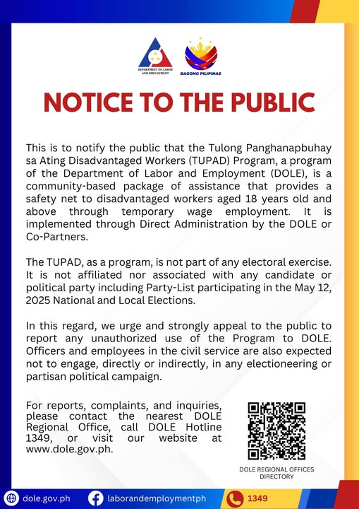 なお、TUPADプログラムはいかなる選挙活動にも関係しておらず、選挙運動の一環ではありません。2025年5月12日に予定されている国家・地方選挙に出馬するいかなる候補者や政党、パーティーリストとも一切関係がありません。
