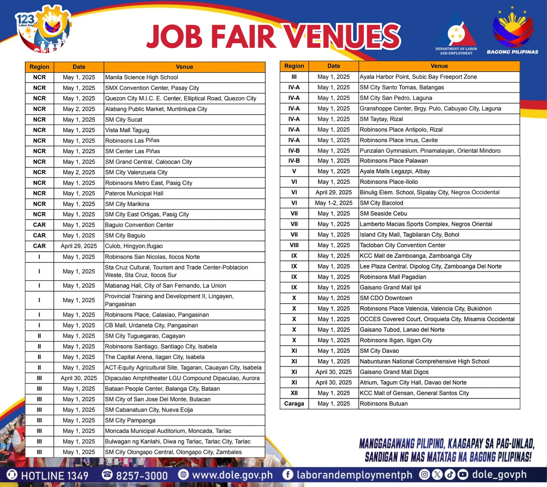全国の労働記念日就職フェアに関する詳細は、最寄りの公共雇用サービスオフィス(PESO)、DOLE地域・地方事務所、またはそれぞれの公式ウェブサイトやソーシャルメディアをご確認ください。