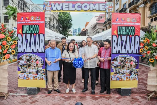 2025年5月15日、マニラ市イントラムロスのヘネラル・ルナ通りにて、労働雇用省(DOLE)のビエンベニド・E・ラゲスマ長官(写真1枚目、右から2番目)をはじめ、フェリペ・N・エガルゴ Jr.次官(写真1枚目、左端)、ウォーレン・M・ミクラット次官(写真1枚目、右端)、DOLE職員組合(OEA)会長マリア・テレサ・M・カバンス氏(写真1枚目、左から2番目)が、二日間にわたるDOLE生計支援バザーの開会を記念してリボンカットを行いました。